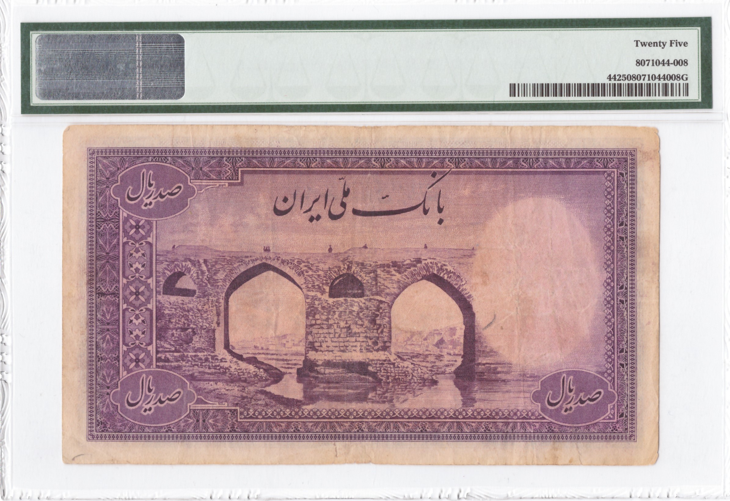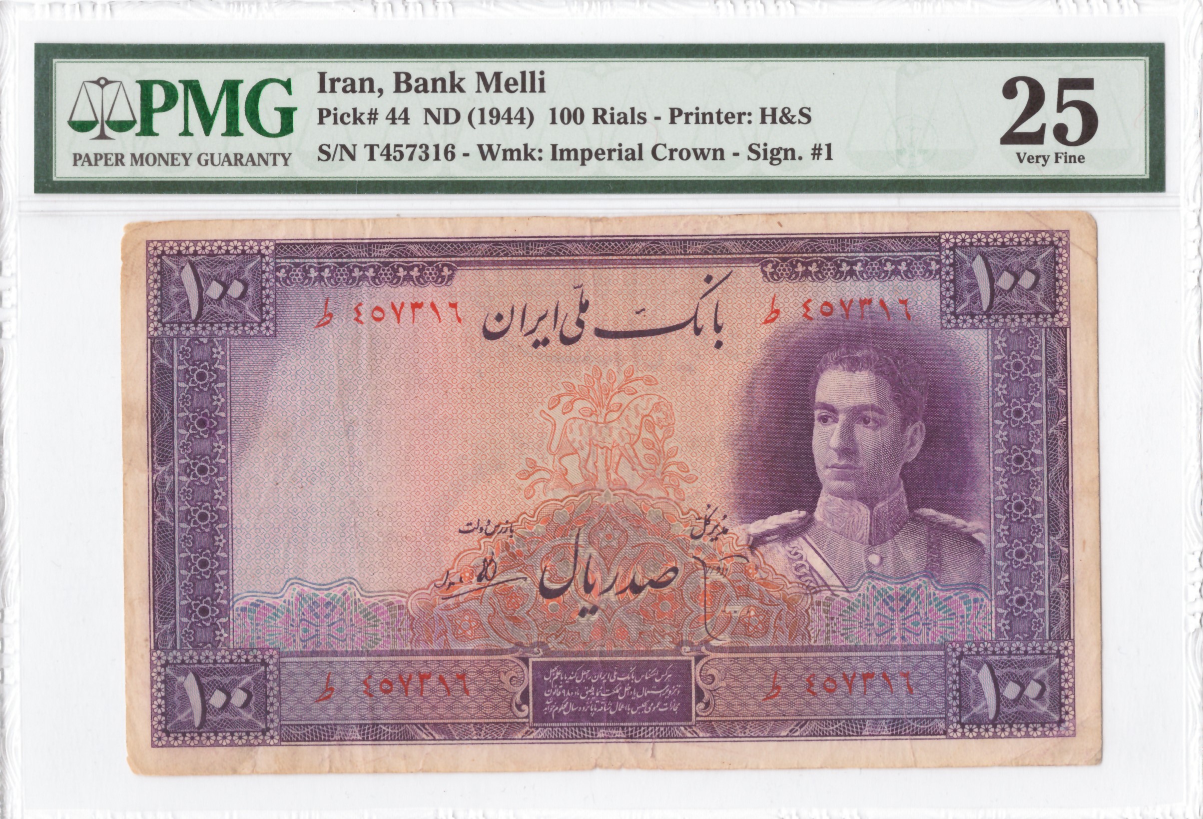 Iran, BankMelli Pick 44 (1944) 100 Rials Wmk: Imperial Crown PMG: 25