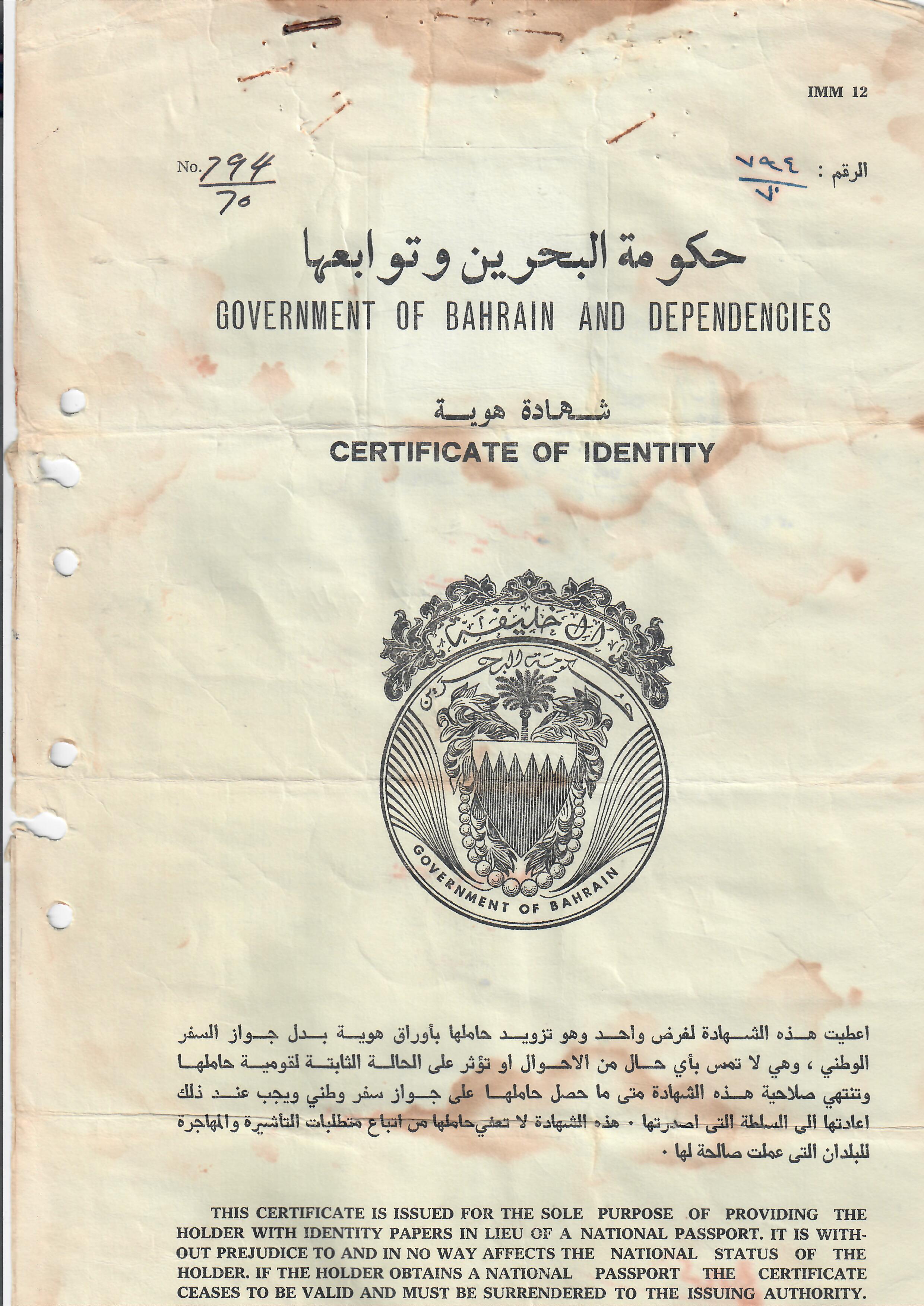 This certificate is used as alternative to passport in the period before Bahrain became a kingdom.