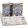 A4 Stock Book (9 x 12 in), non-padded hard cover with stamp motifs, 16 white card stock pages, 9 glassine strips per page, single glassine interleaving, rigid binding.